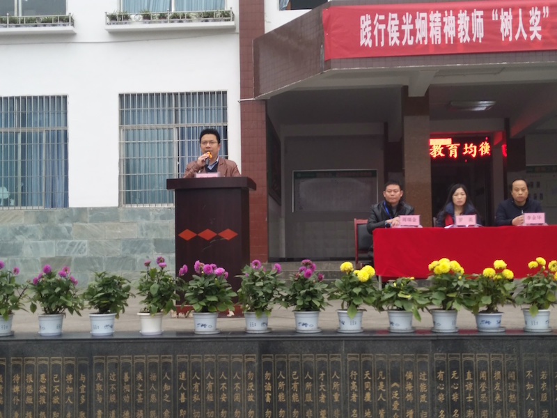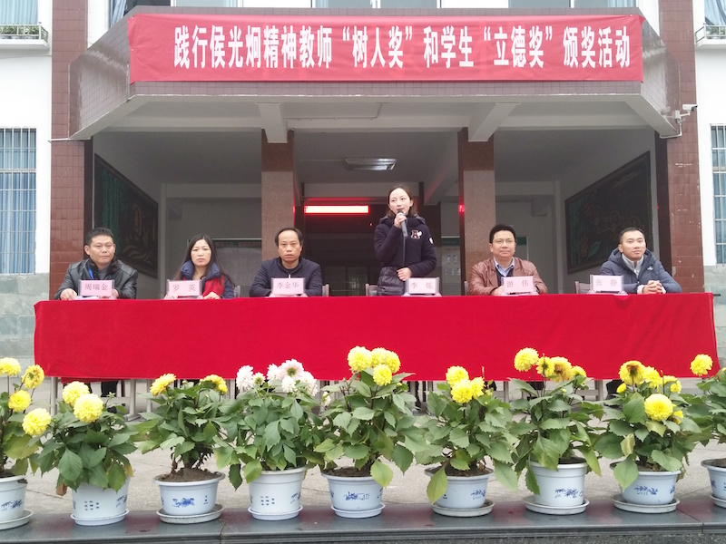 为进一步贯彻落实西南大学与四川长宁县签署的科教合作协议,共创共建“西南大学侯光炯小学”,宣传宣扬侯光炯精神,弘扬正能量,创建和谐美好教育环境,通过侯光炯精神激励优秀教师和优秀学生,2017年12月28日,西南大学基础教育集团在长宁竹海小学(西南大学侯光炯小学)举行践行侯光炯精神教师“树人奖”和学生“立德奖”颁奖仪式。长宁县副县长李炼,西南大学基础教育集团副总经理游伟、长宁县教体文广局副局长李金华、西南大学基础教育集团总经理助理张静以及竹海小学的全体领导和师生共同出席了颁奖仪式。大会由竹海小学校长周瑞金主持。