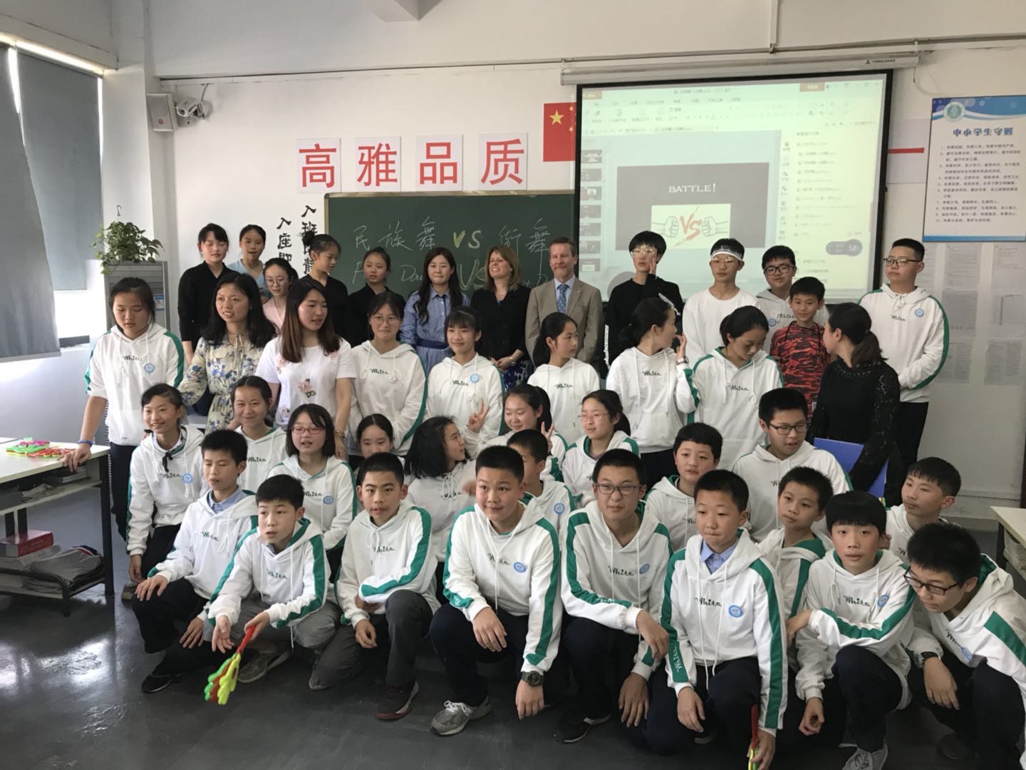 当天下午,陈总和汪主任陪同劳雷尔教育局代表,访问了西南大学重庆江南中学校。江南中学赵校长、孟副校长等人带领师生代表,亲切接待了一行人的到访。随后,陈总、Delorme局长等人走进了学生的体育课、美术课、舞蹈课等课堂,见证了江南中学的办学特色。美术课上,同学们还将自己制作的具有中国特色的剪纸赠予外宾们。Hipps局长对同学们流利的英语表达能力表示了夸奖。